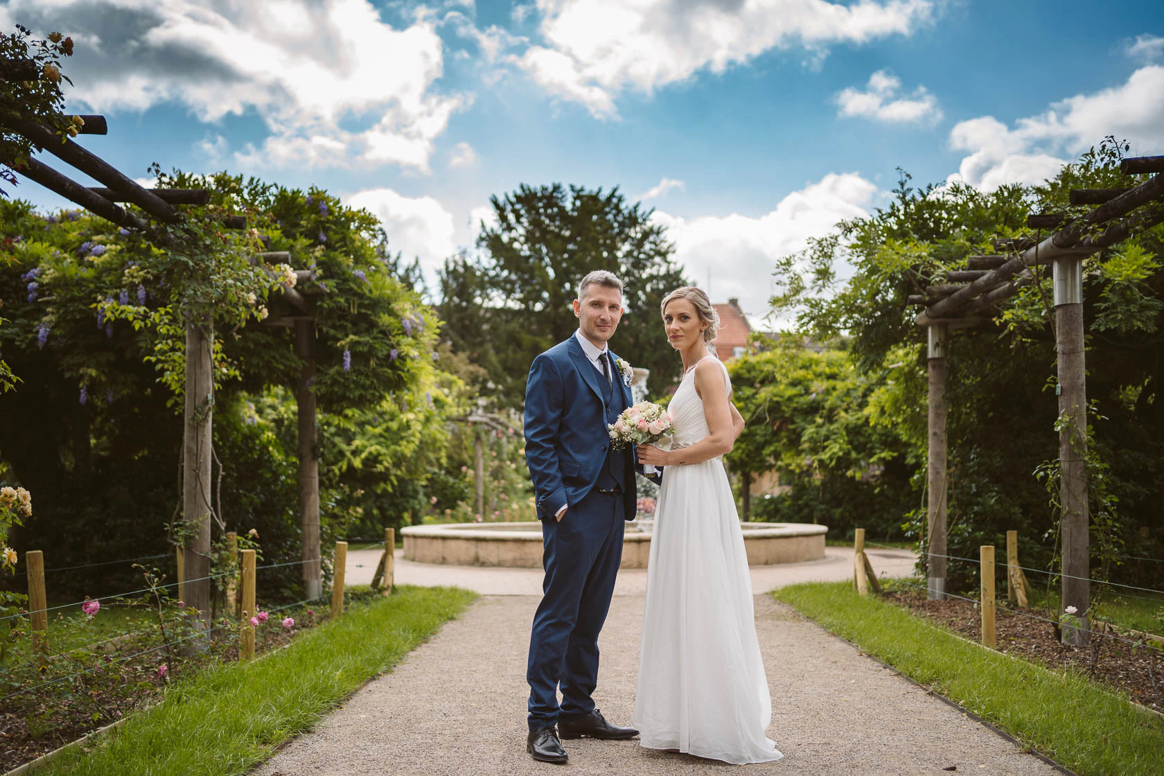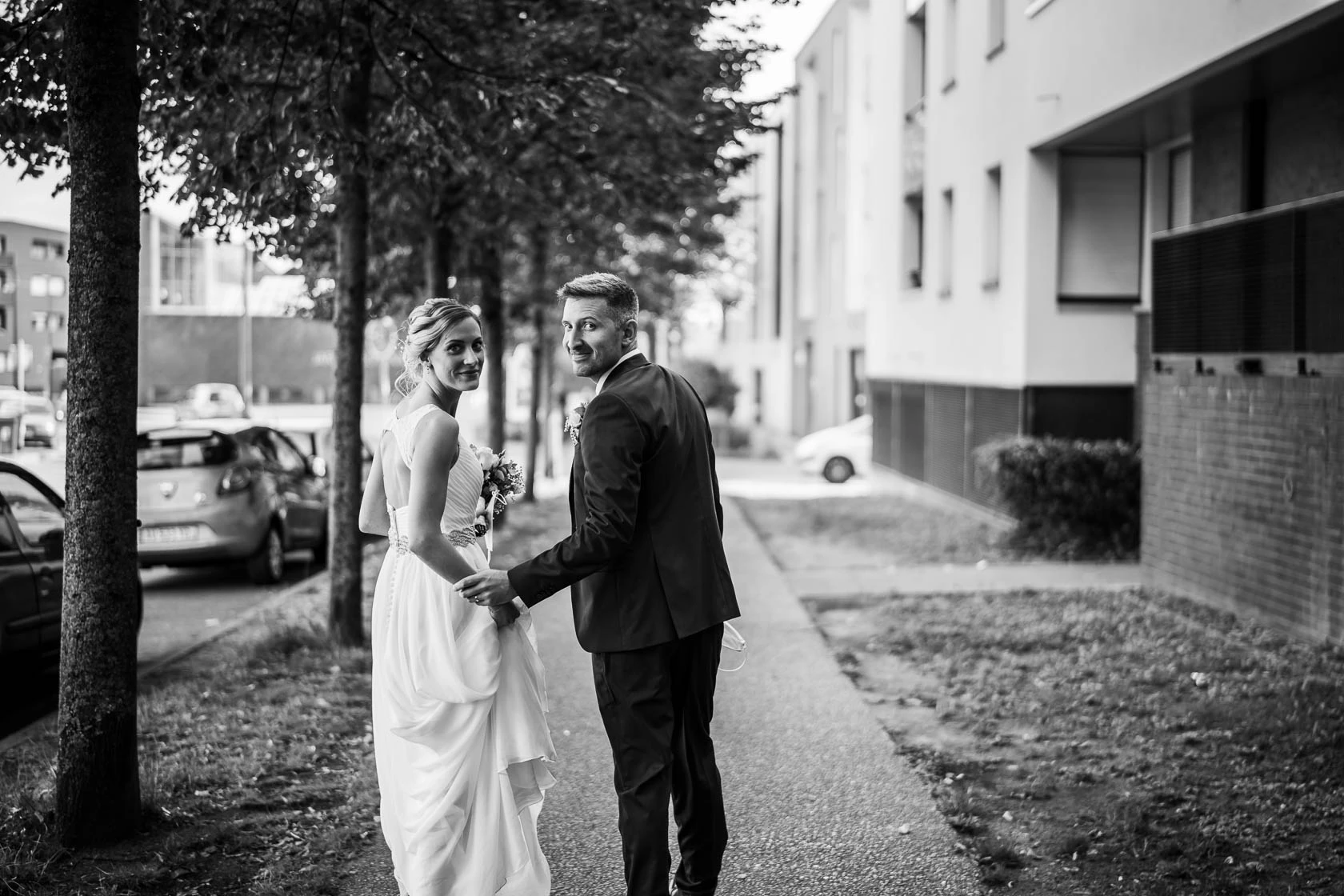 Le contraste entre la mairie et le jardin fonctionne particulièrement bien. D’un côté, la force symbolique du mariage civil. De l’autre, un lieu plus paisible, plus végétal, où le couple peut respirer, se retrouver et vivre pleinement ce moment à deux. Pour de futurs mariés, c’est un très bel exemple de séance couple courte mais forte, capable de produire des images raffinées sans casser le rythme de la journée.