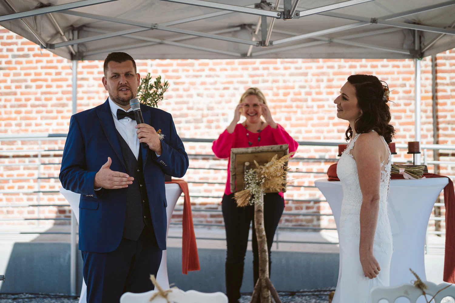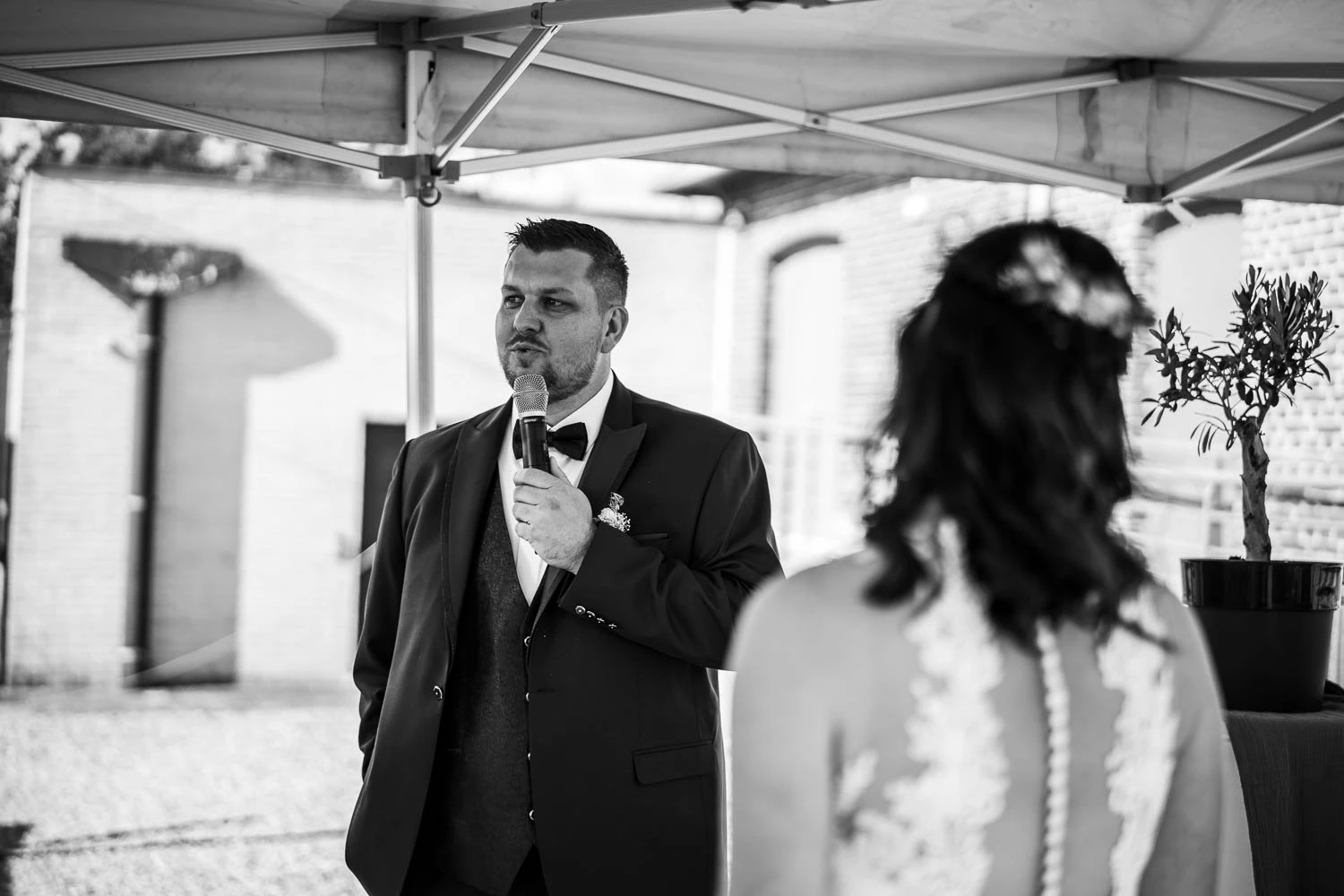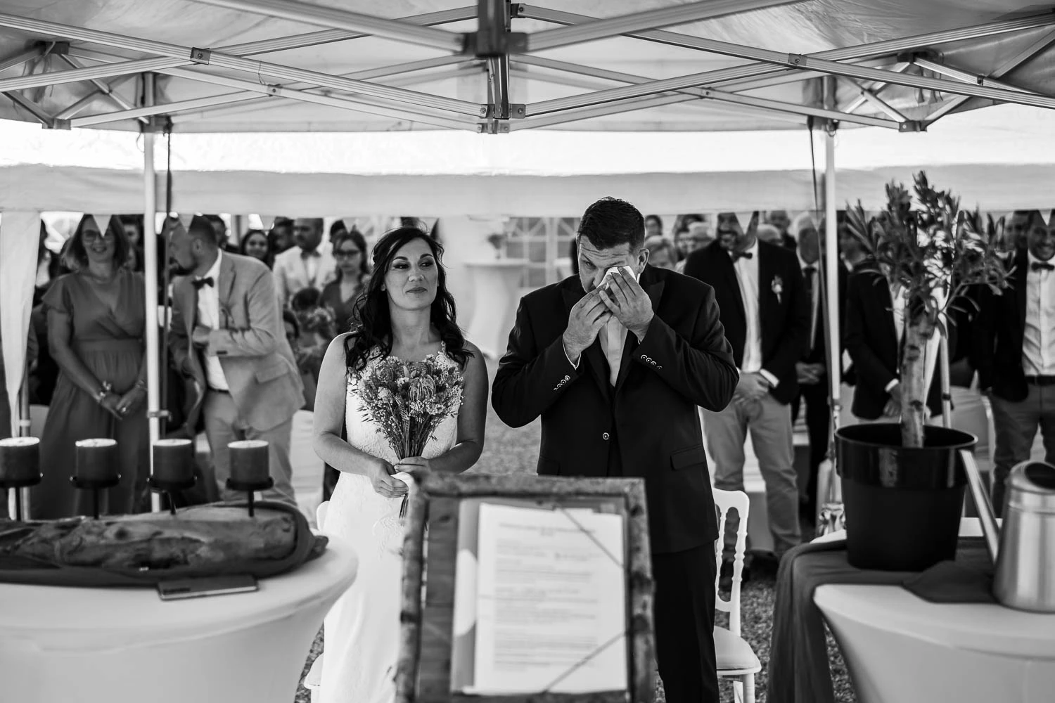 J’aime particulièrement ce type de cérémonie, parce qu’elle laisse une vraie place aux mots, aux souvenirs et à la personnalité du couple. Elle permet de construire un moment plus libre, plus incarné, souvent très riche en émotions. Les discours des proches ont donné beaucoup de relief à cet instant. Il y avait des rires, des regards chargés d’émotion, quelques larmes discrètes, et cette intensité particulière que l’on ressent lorsque chaque prise de parole a vraiment du sens.