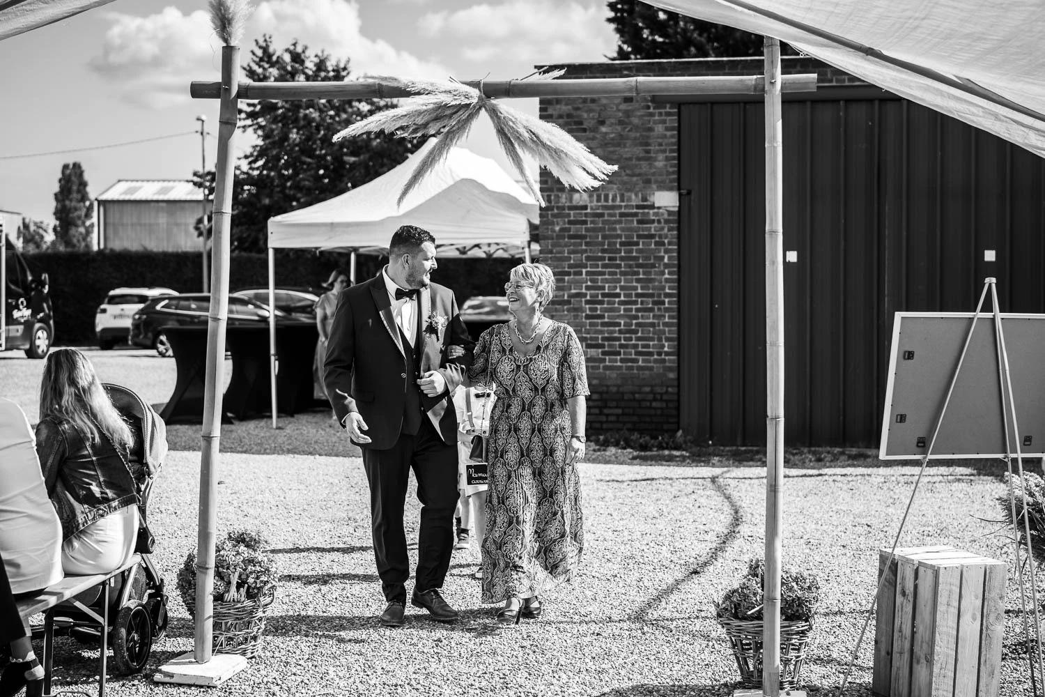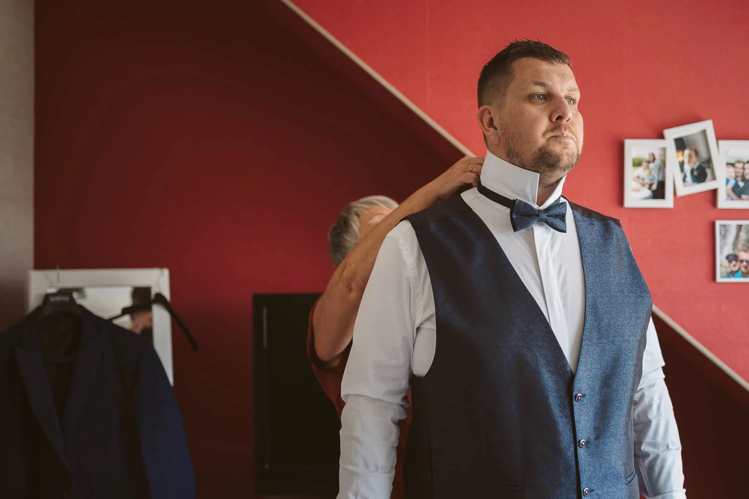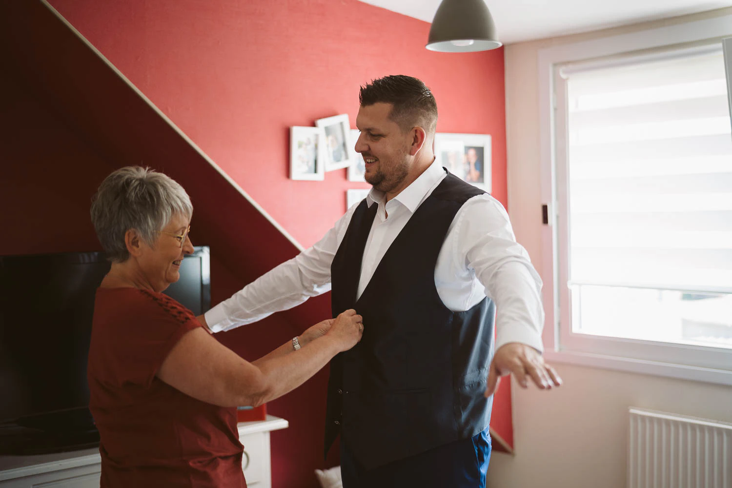 Aux côtés de sa maman, Aurélien a pris le temps d’enfiler son costume dans une atmosphère simple et intime. J’aime beaucoup photographier ces moments, parce qu’ils racontent déjà une partie du mariage. Il y a l’attente, les derniers ajustements, les gestes précis, les regards complices et cette émotion discrète qui s’installe avant les grandes étapes de la journée.