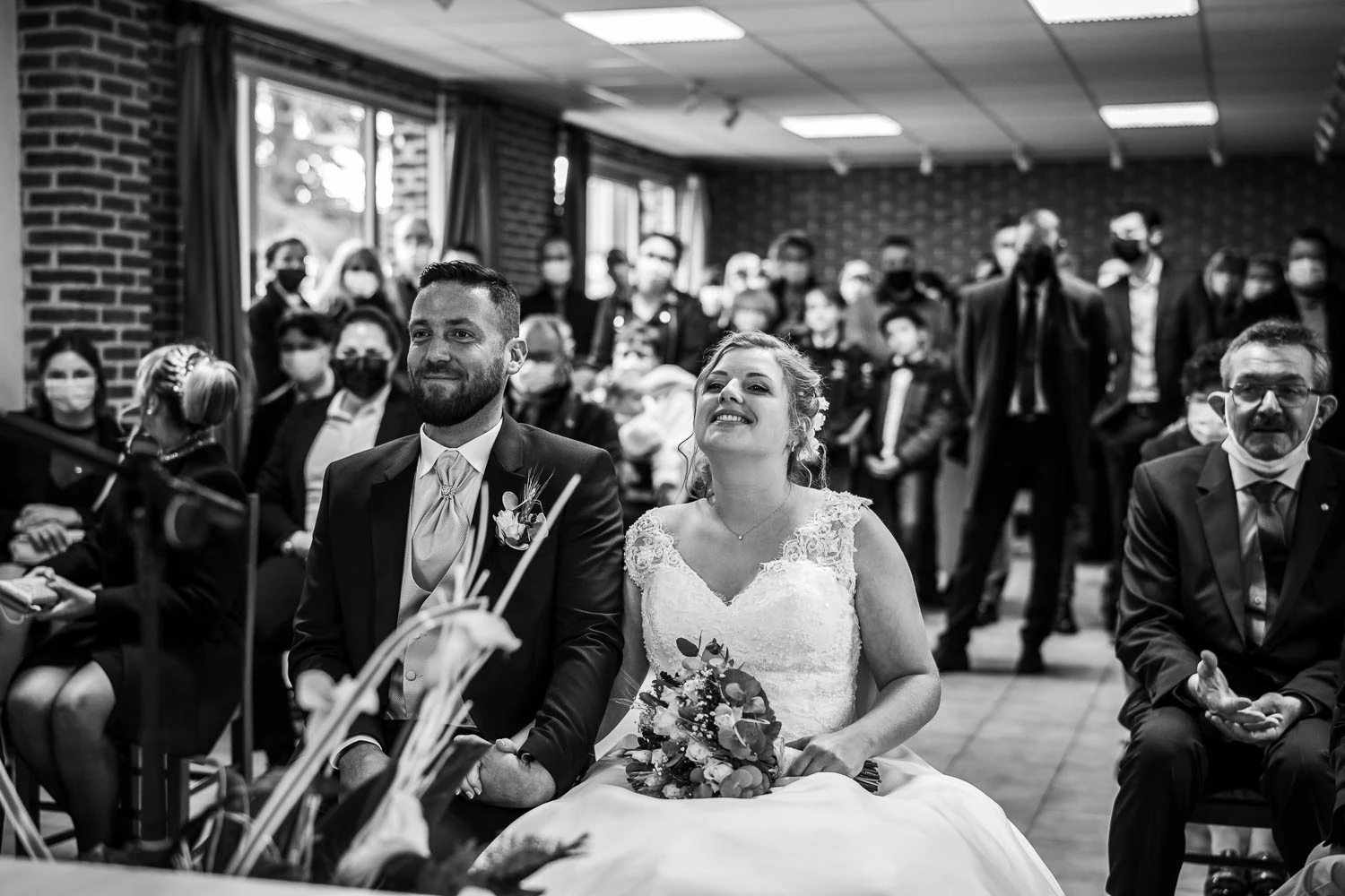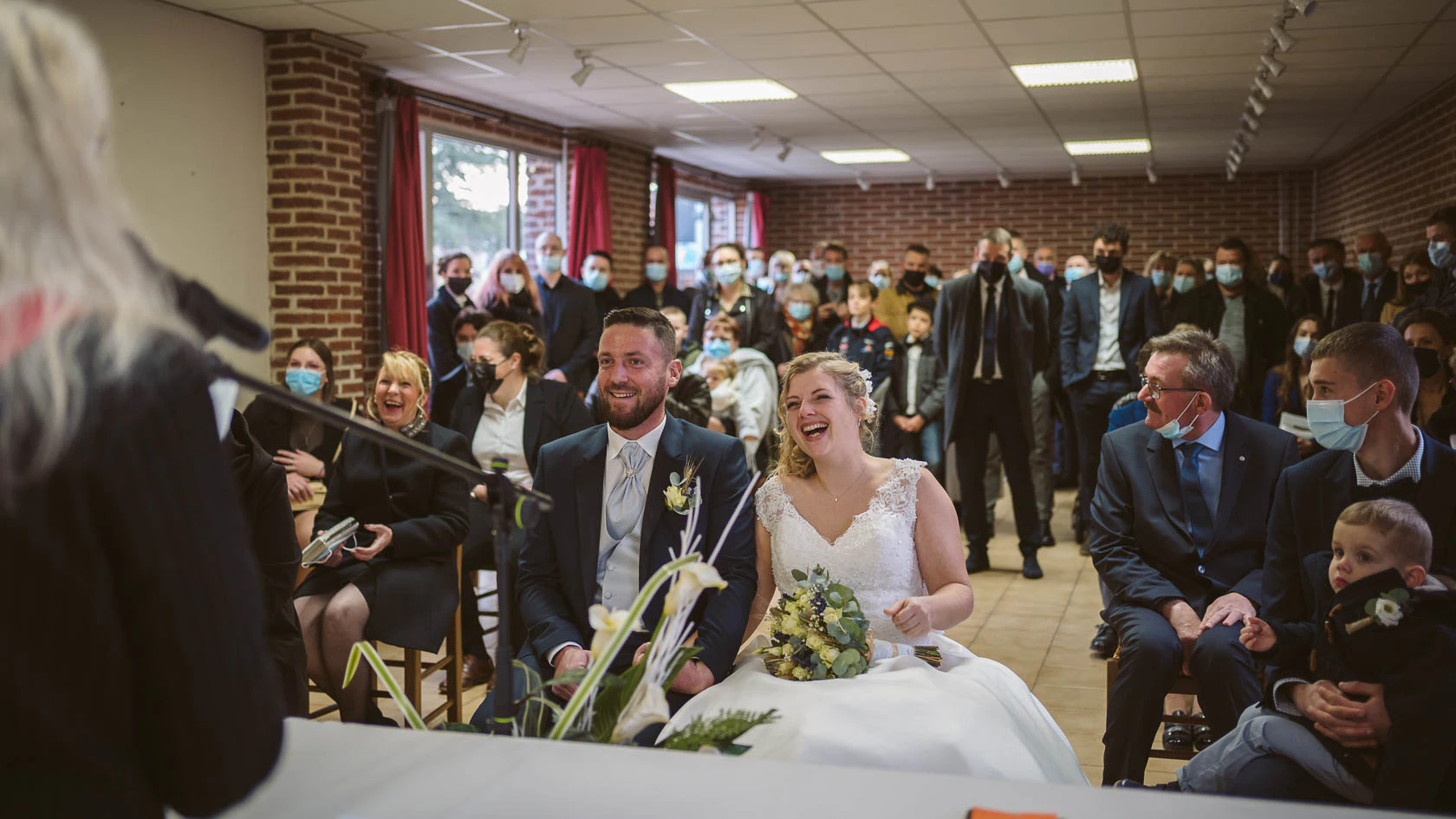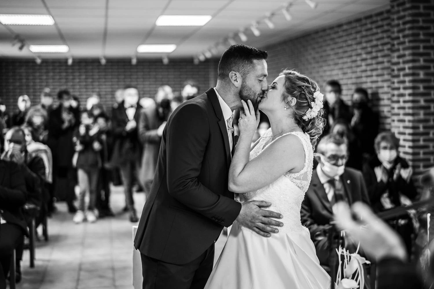 Le mariage civil est toujours un moment fort dans un reportage. C’est souvent là que tout devient concret. Il y a l’entrée des mariés, les mots officiels, les signatures, le baiser, puis les réactions des proches. À Flines-lez-Raches, cette cérémonie avait ce mélange de simplicité et d’intensité que j’aime particulièrement photographier.