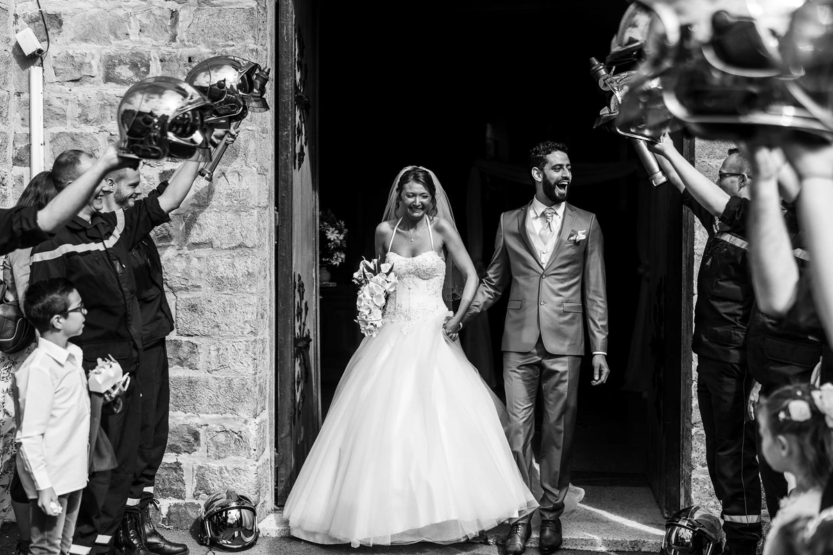 À la sortie de l’église, Angela et Jonathan ont vécu un second moment particulièrement fort avec une nouvelle haie d’honneur des pompiers. Cette sortie a prolongé l’émotion de la journée avec une intensité encore plus marquante.